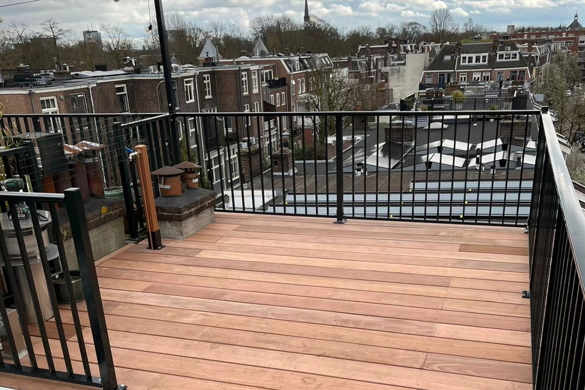 Het striphekwerk kenmerkt zich door de rechthoekige spijlen van 14×28 mm, die een moderne en verfijnde uitstraling geven. De dekrail met afgeronde kanten van 60 mm zorgt voor een zachte, maar toch robuuste afwerking. De balusters, waarop de hekken stevig bevestigd worden, hebben een afmeting van 50x50x4 mm en garanderen een stabiele constructie.