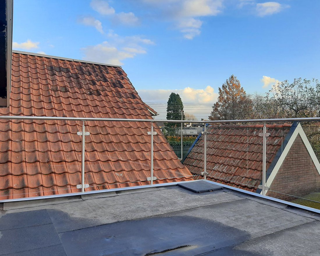 Een groot voordeel van RVS is dat het enorm sterk én onderhoudsvriendelijk is. De RVS staanders en handregel van deze glazen balustrade zijn bestand tegen weer en wind, waardoor je je geen zorgen hoeft te maken over roest of verkleuring. Daarnaast geeft RVS de balustrade een moderne, luxe uitstraling die goed past in zowel binnen- als buitentoepassingen. Je geniet dus niet alleen van een veilige oplossing, maar ook van een stijlvolle afwerking die jarenlang meegaat.